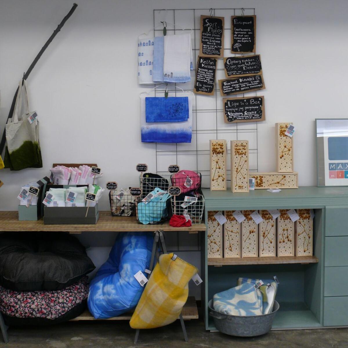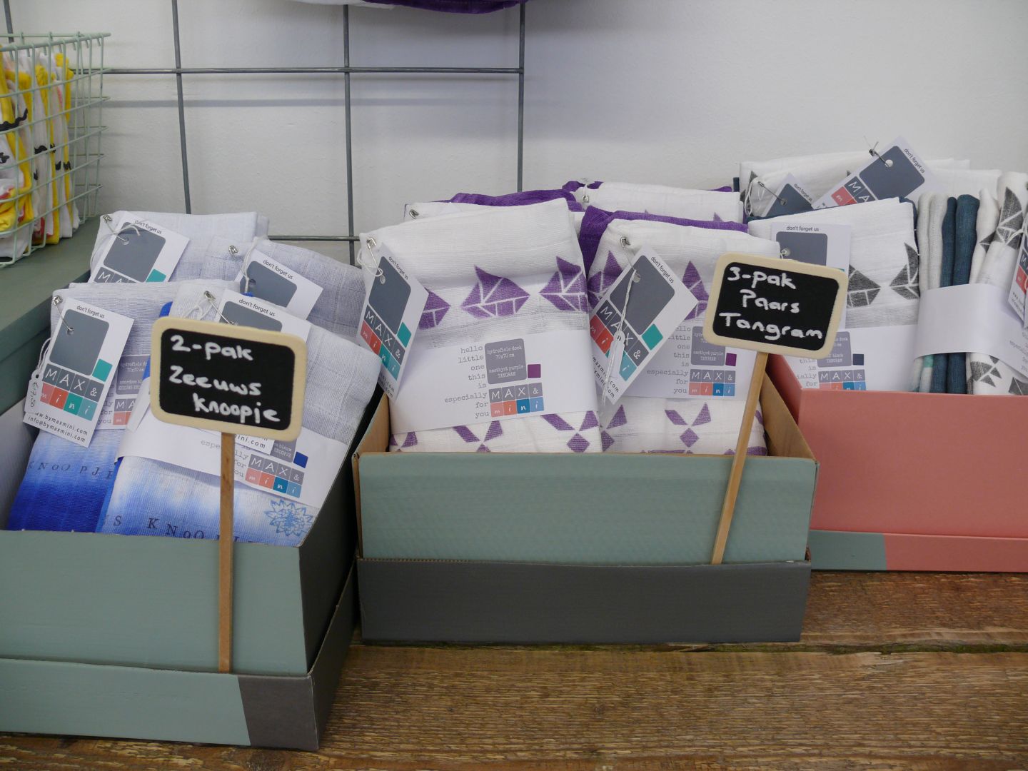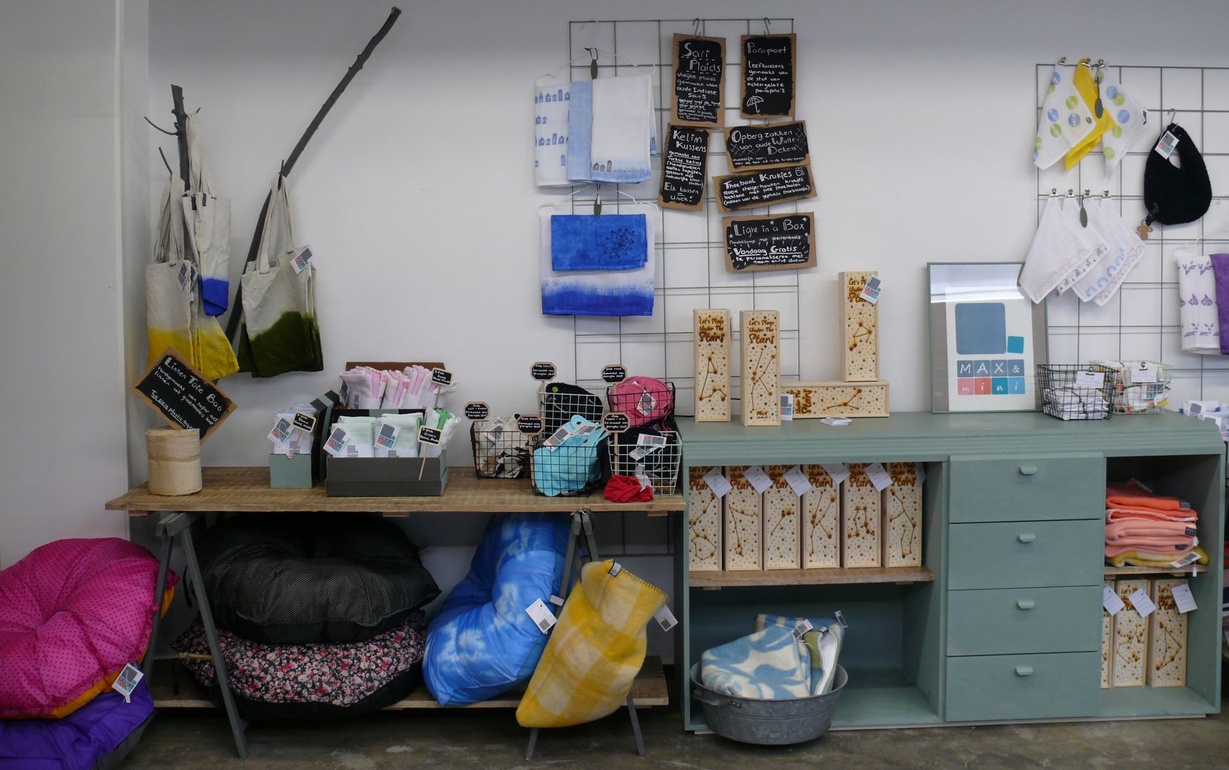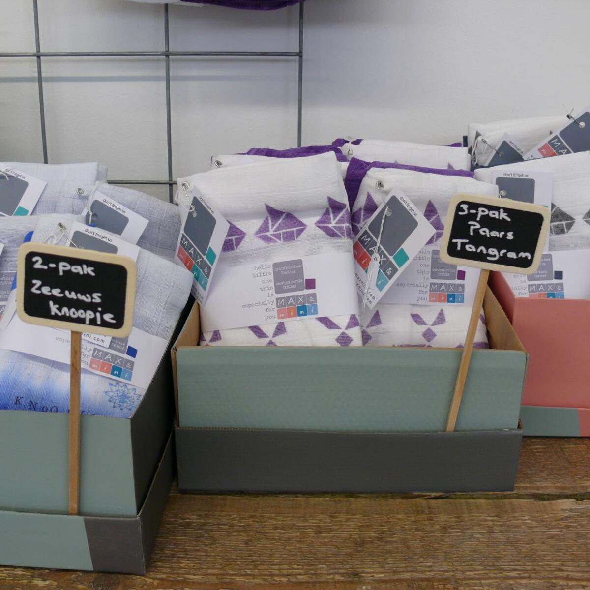 Alle artikelen uit het assortiment van MAX&mini die je online kunt vinden hebben een mooi plekje gekregen in de winkel en zijn hier dus in het echt te bekijken, voelen, ruiken, etc...! Naast de producten van MAX&mini hebben we in de winkel ook nog toffe artikelen van andere mooie merken in de verkoop.