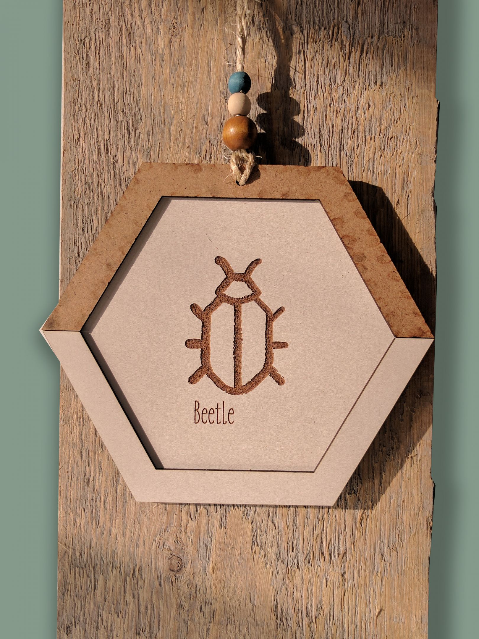Deze 6-hoekige houten wandhanger met een stoere kever is gemaakt van hergebruikt verpakkingsmateriaal. Door het weg laseren van de witte coating komt het hout weer tevoorschijn in de vorm van een kever.