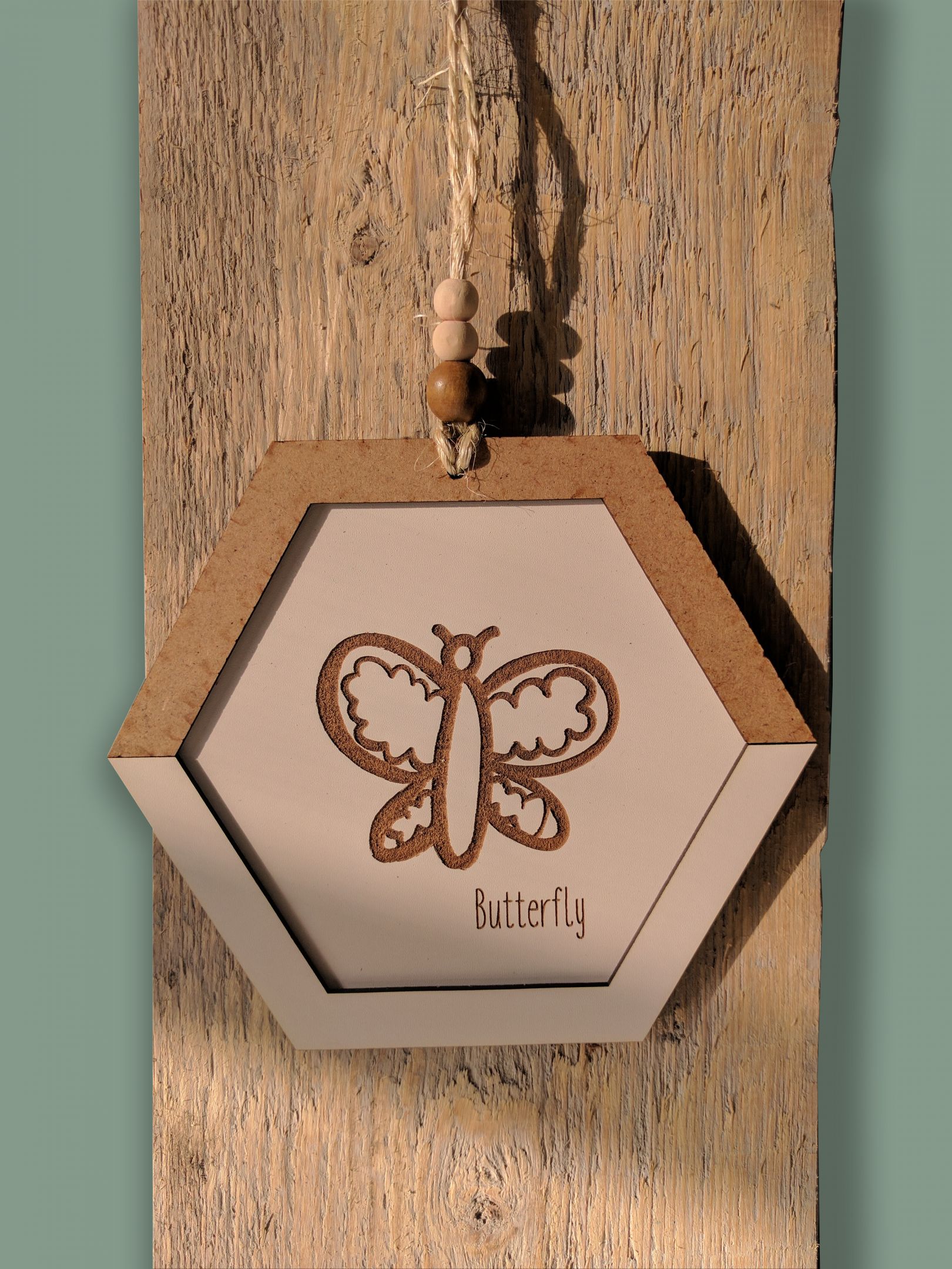 Deze 6-hoekige houten wandhanger met een vrolijk vlindertje is gemaakt van hergebruikt verpakkingsmateriaal. Door het weg laseren van de witte coating komt het hout weer tevoorschijn in de vorm van een vlinder.